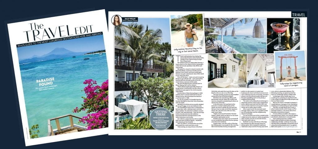 When the team at Batu Karang Lembongan Resort & Spa reads professional travel journalist comments such as “Paradise Found” (Sally Nolan for WHO Magazine) & “You can’t help but fall under its spell” (Rowena Ryan for Escape Magazine), a profound amount of gratitude for our guests & pride for the team shines. We are excited to share our recent features in Australia-wide publications such as Escape Magazine, WHO Magazine, The Sydney Morning Herald, The Sun Herald, +852 Hong Kong Airlines Magazine & Jetstar Magazine, to name a few, many of which have been re-printed in other publications.